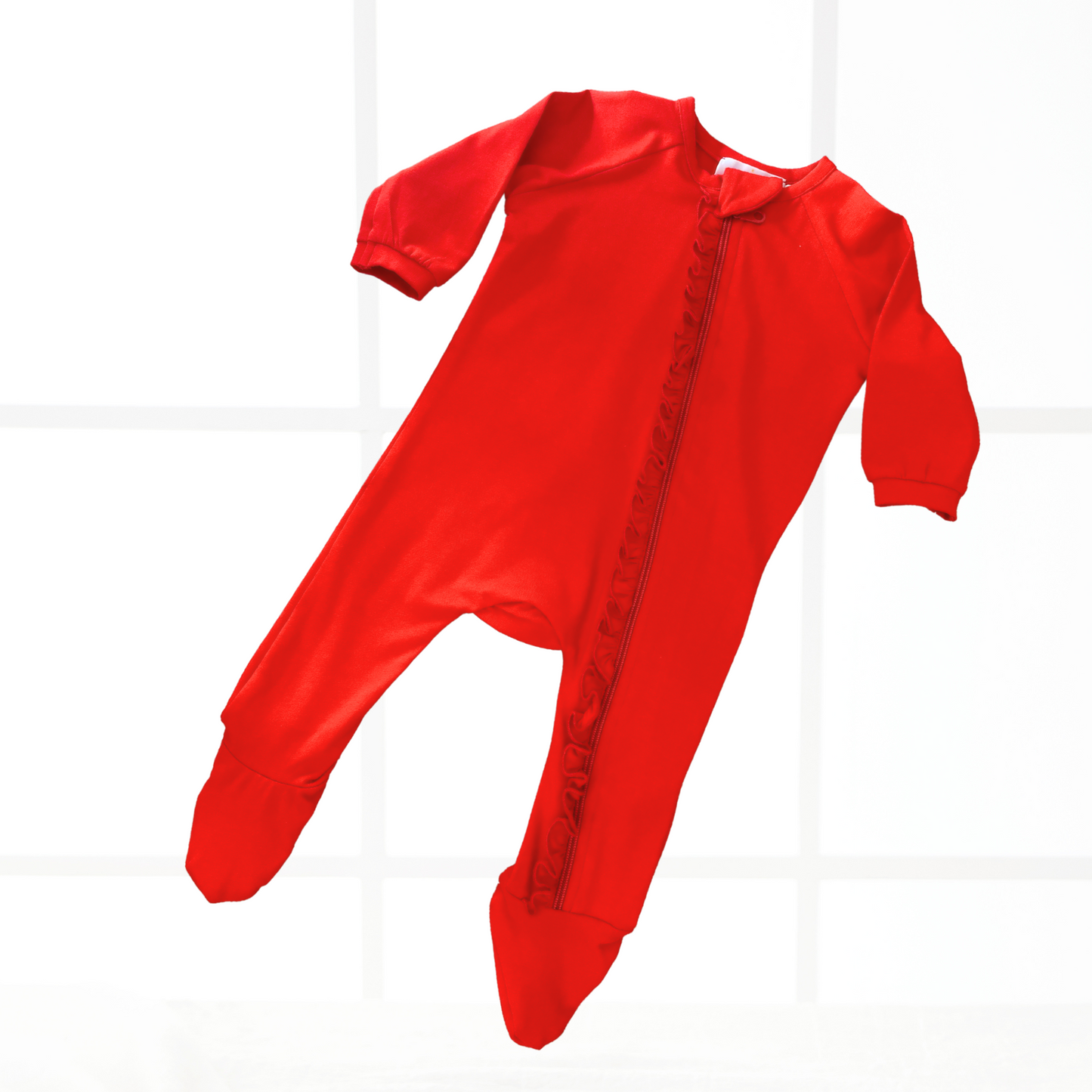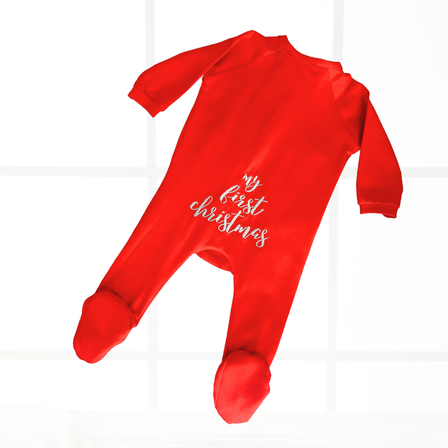 This red baby sleepsuit is a must-have for celebrating your little one's first Christmas. Crafted from organic cotton, the Christmas romper features a beautiful silver embroidered "MyFirstChristmas" design and zipper closure.