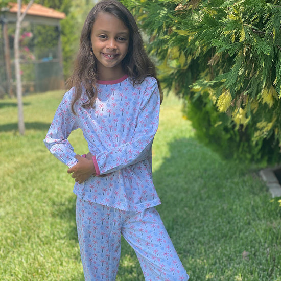 Stay comfy, cool, and coordinated with the Pandora Complete T-Shirt & Pants Kids Pajama! This 100% cotton set is the ultimate in sweet dreams style, with a fun palm print to boot.
