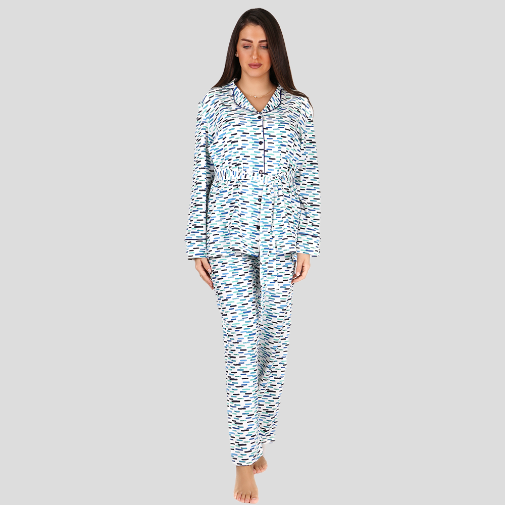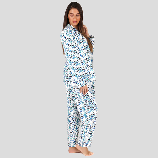 The Squiggle Pajama Set in blue brings a playful twist to maternity and postpartum comfort. Crafted from soft cotton with a charming squiggle print, this set includes a button-down shirt with a notched collar and pocket, paired with relaxed-fit pants. The nursing-friendly design makes this pajama both functional and stylish, perfect for cozy nights during and after pregnancy.